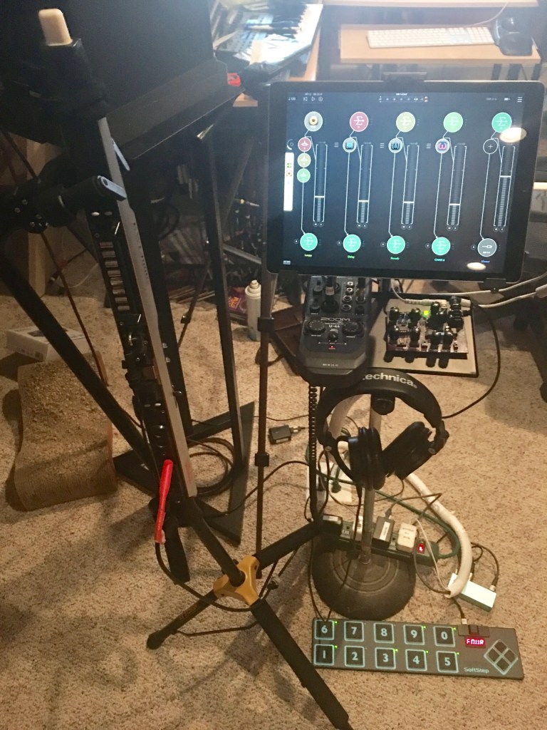 I’m super happy with the dRachEmUsiK live rig for 2017! The new iPad Pro is powerful enough to be able to handle hardware and virtual instruments and processing in real time without a laptop or external mixers. The entire rig can be carried on to an airplane and takes under 15 minutes to set up and break down. Amazing. Cables, DI are stored in the side pocket of the EWI case. All I need from the venue is a single mic stand.