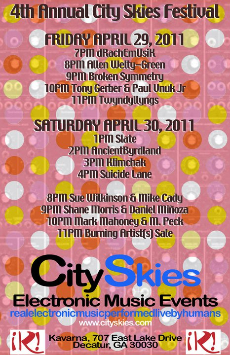 The 4th Annual City Skies Electronic Music Festival will be held in the Atlanta area on April 29th and 30th, 2011. The list of performers include some of the best electronic musicians from around the U.S. heard on radio stations like Music From the Hearts of Space, Echoes, Star’s End, Soma FM, StillStream, Galactic Travels, and are from Arkansas, Florida, Georgia, Indiana, New Jersey, Pennsylvania, Tennessee, and Wisconsin.