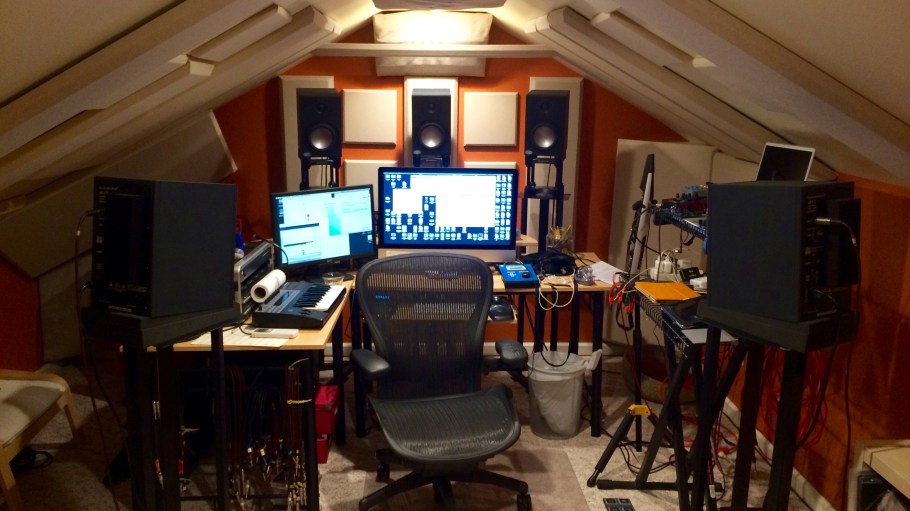 The studio is finally completely finished and I’ve been up and running for a few weeks. Here are some real world working pictures of the space. The room sounds great and is incredibly comfortable and versatile.