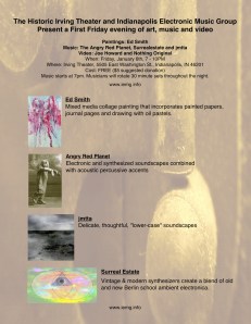Entering it’s third year, The Indianapolis Electronic Music Group is thrilled to have found a new home at the Irving Theater. The performance on January 6th will be the third in a series of bi-monthly First Friday concerts featuring new and unusual electronic and electroacoustic musicians, visual artists and video from the Indianapolis area as well as featuring musicians and artists from the USA and Canada.