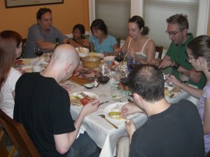 Every Thursday night the members of Faux Pas Quartet (Aaron Urbanski, Charles Shriner, Duncan Putman, Jen Schmetzer) gather together and share a wonderful meal – cooked by my partner Burt Woodruff – wine, conversation and whatever with friends before moving into the studio space and making bleepy, blurpy, glitchy music for a few hours. Nerd Hop! So as you may have suspected there is a party going on here at the house at the same time you folks are having a party and listening.
