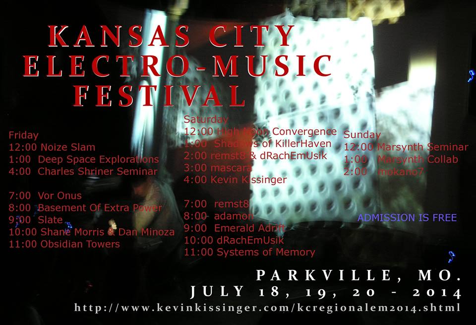 Hosted by Kevin Kissinger and Shane Morris, the KC Regional electro-music.com  festival encompasses all styles of electronic music, DIY instruments, performances, collaborations, and demonstrations.
